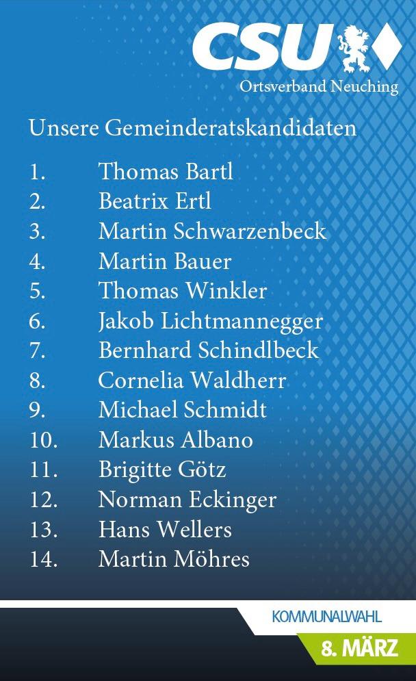 01.02.2026 ab 10 Ohr Frühschoppen mit Kandidatenvorstellung beim Neuwirt in Oberneuching 07.02.2026 ab 7 Uhr Infostand in Niederneuching / Dorfladen…
