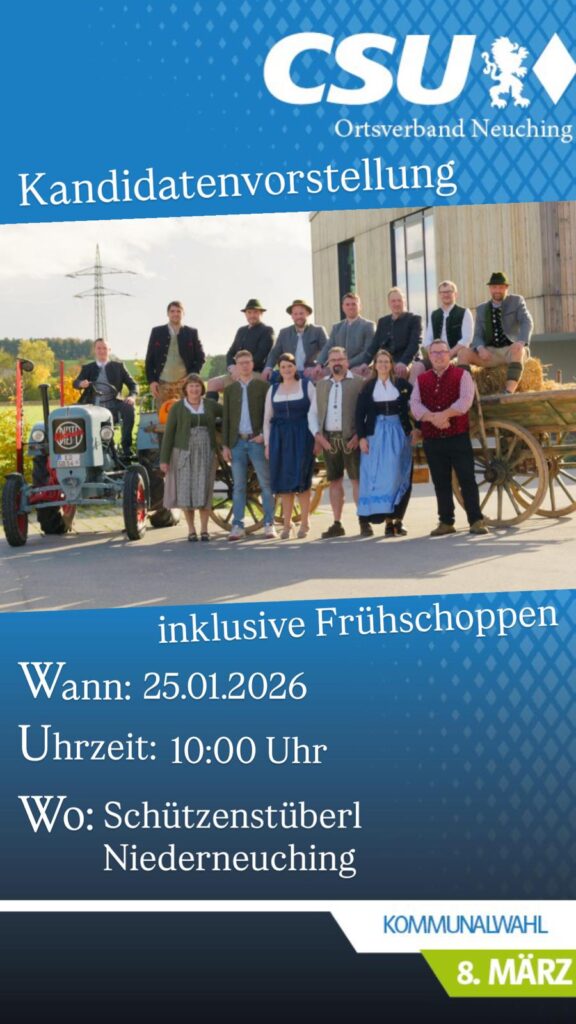 Jahresrückblick 2025 Stabile Demokratie, lebendige Gemeinschaft und klare Zukunftsperspektiven Das Jahr 2025 war für die CSU Neuching geprägt von politischer Verantwortung, lebendigem Vereins- und Gemeinschaftsleben sowie wichtigen personellen und inhaltlichen Weichenstellungen für die kommenden Jahre. Im Mittelpunkt stand die Jahreshauptversammlung am 28. März 2025, bei der Bürgermeister und Ortsvorsitzender Thomas Bartl gemeinsam mit zahlreichen Mitgliedern […]