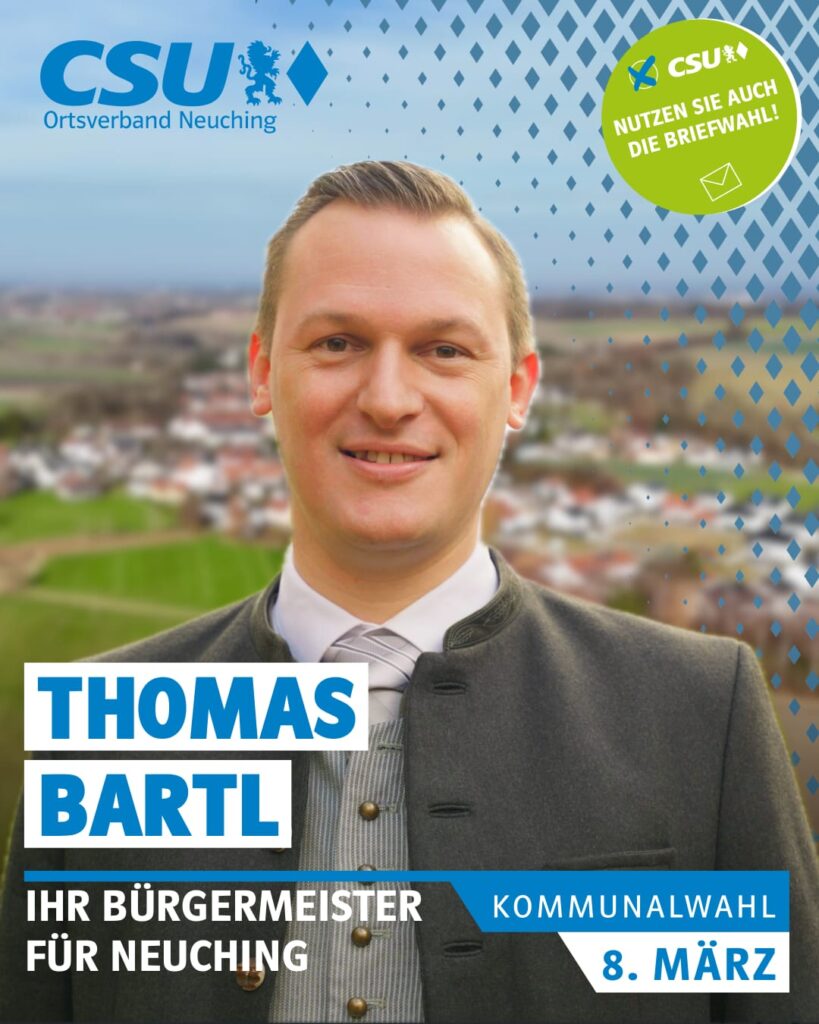 Wir stehen für Zusammenhalt, Tradition und eine starke Zukunft –gemeinsam mit unserem Ersten BürgermeisterThomas Bartl. 📬 Briefwahl ab 16. Februar 2026 Neuching im Herzen – damit Heimat Heimat bleibt. Wir würden uns freuen, Sie dort begrüßen zu dürfen!