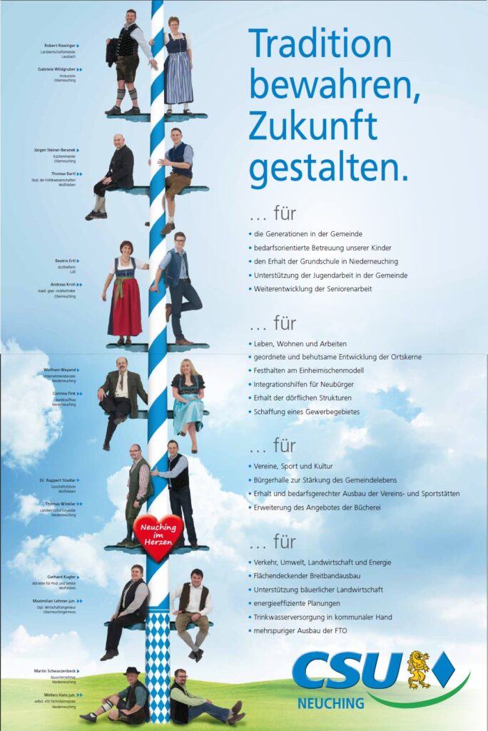 Kandidatenvorstellung: 5.2.2014 Niederneuching, Ortszentrum im Schützenstüberl um 19:30 27.2.2014 Oberneuching beim Neuwirt um 19:30 Infostand mit den Kandidaten aus Gemeinde und Kreis: 1.3.2014 in Oberneuching beim Alten Wirt um 7:00 – 11:00 Uhr8.3.2014 in Niederneuching, Ortszentrum beim KORNEK um 7:00 – 12:00 Uhr
